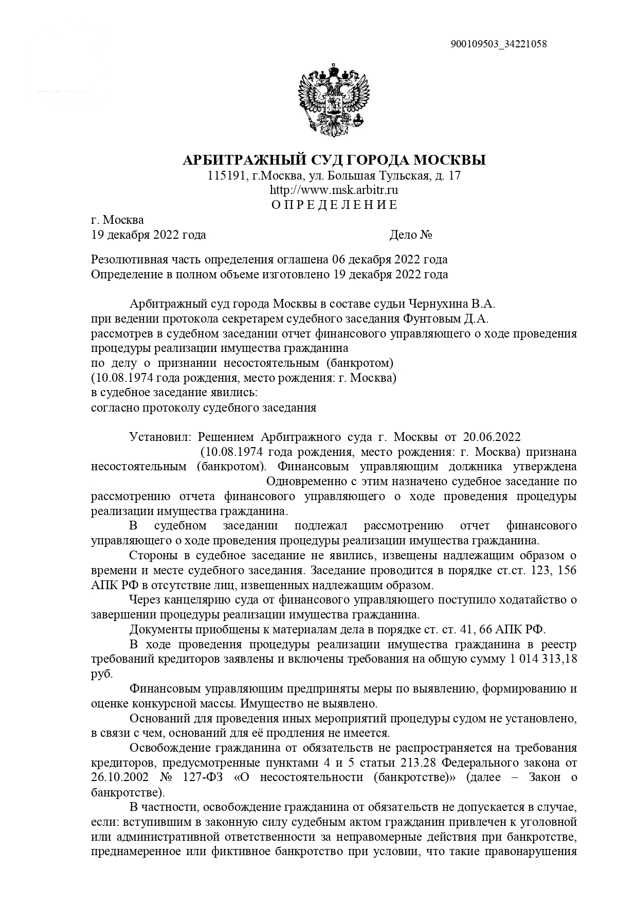 После завершения процедуры банкротства вы получите Определение Арбитражного суда об освобождении от дальнейшего исполнения требований кредиторов. Его можно увидеть на сайте Арбитражного суда по фамилии или номеру дела.